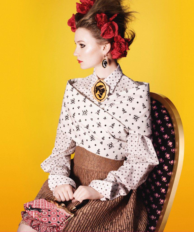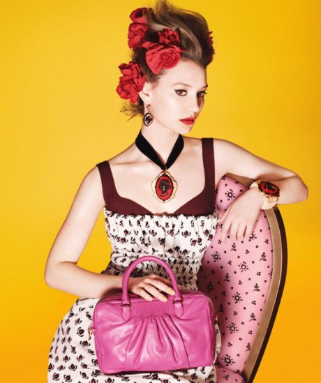 i’m only lukewarm on miu miu’s spring 12 garments and prints, but i love the accessories! miu miu always has a way of making high end bags and jewelry cute and quirky. the brightly colored campaign makes these accessories pop even more. mia wasikowska photographed by david sims.