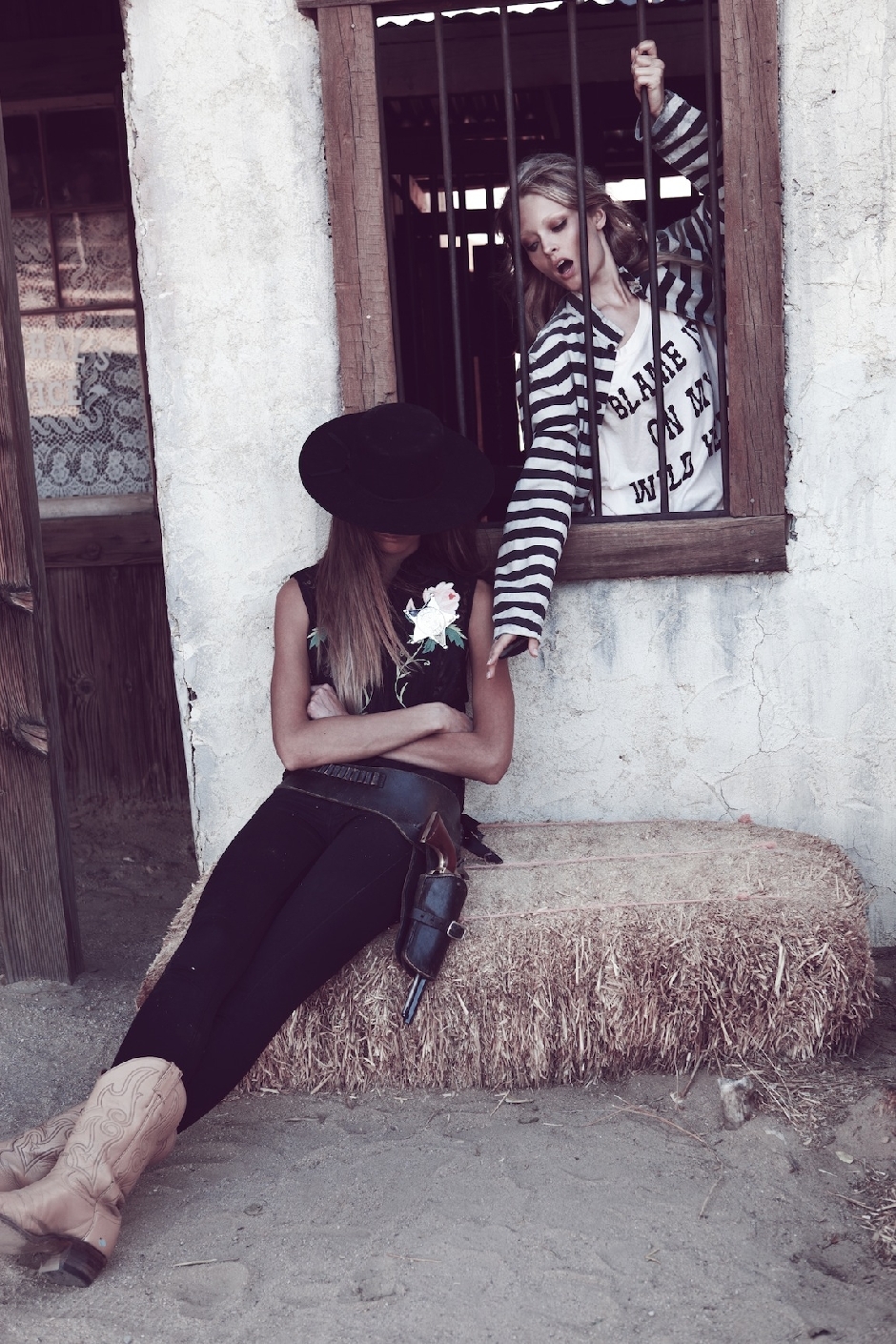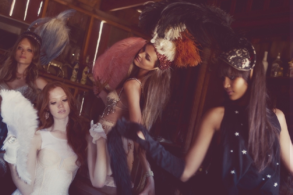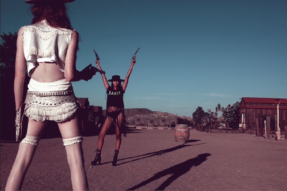 wildfox mixes their usual quirky printed tees with rows of ruffles, tulle and netting for this wild west shoot. all the great elements of western trouble….barmaids, cowgirls, whisky and guns.